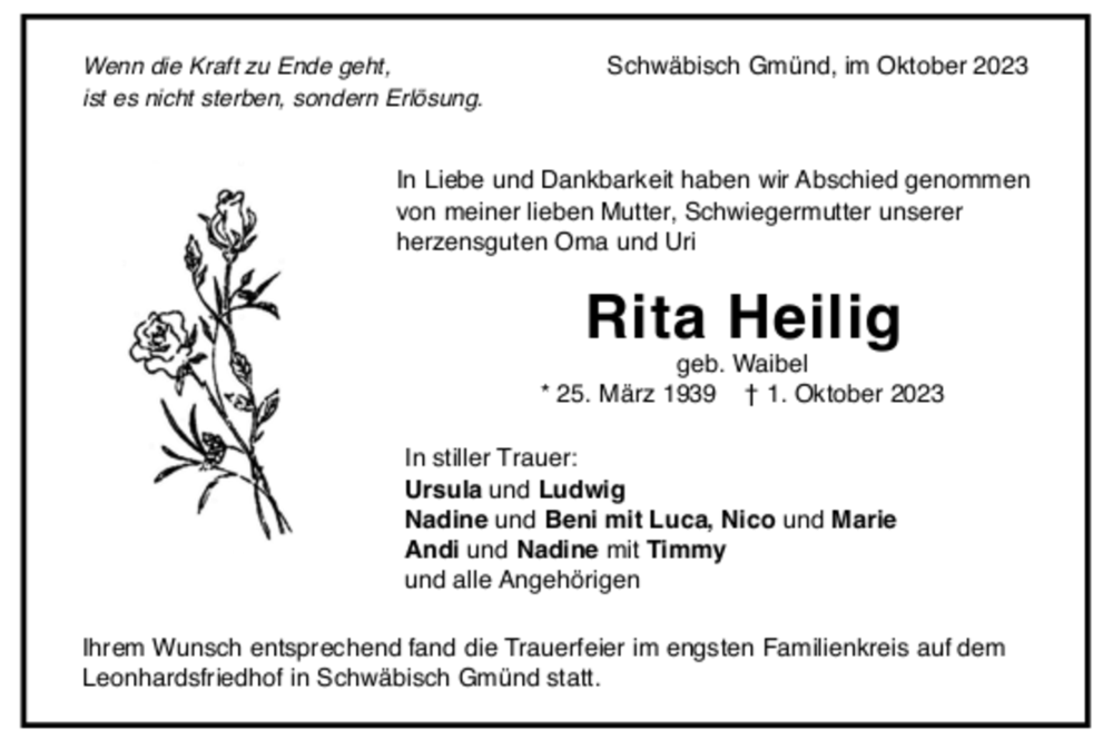 Hier finden Sie alle Traueranzeigen aus der Zeitung, die bisher für Rita Heilig erschienen sind. Weitere Traueranzeigen, die in der Zeitung erscheinen, werden hier ebenfalls aufgelistet