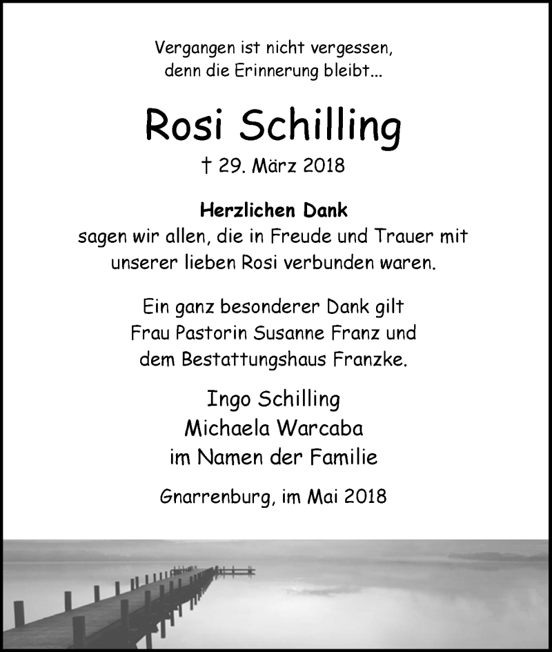 Hier finden Sie alle Traueranzeigen aus der Zeitung, die bisher für Rosi Schilling erschienen sind. Weitere Traueranzeigen, die in der Zeitung erscheinen, werden hier ebenfalls aufgelistet