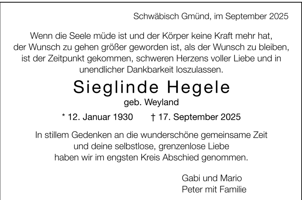 Hier finden Sie alle Traueranzeigen aus der Zeitung, die bisher für Sieglinde Hegele erschienen sind. Weitere Traueranzeigen, die in der Zeitung erscheinen, werden hier ebenfalls aufgelistet