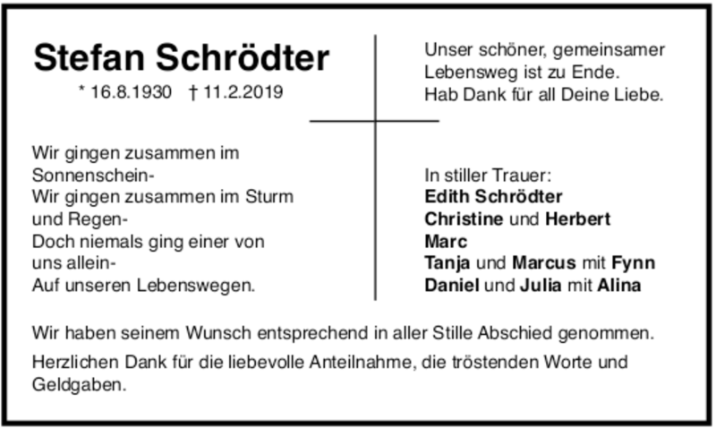 Hier finden Sie alle Traueranzeigen aus der Zeitung, die bisher für Stefan Schröder erschienen sind. Weitere Traueranzeigen, die in der Zeitung erscheinen, werden hier ebenfalls aufgelistet