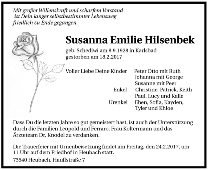 Hier finden Sie alle Traueranzeigen aus der Zeitung, die bisher für Susanna Emilie Hilsenbek erschienen sind. Weitere Traueranzeigen, die in der Zeitung erscheinen, werden hier ebenfalls aufgelistet