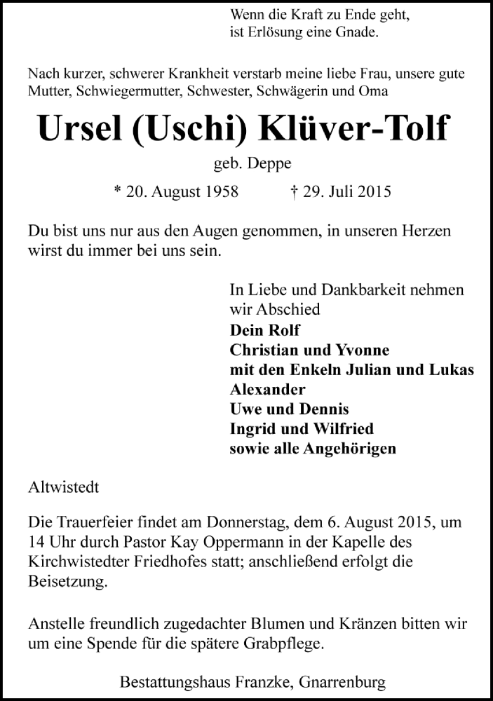 Hier finden Sie alle Traueranzeigen aus der Zeitung, die bisher für Ursel Klüver-Tolf erschienen sind. Weitere Traueranzeigen, die in der Zeitung erscheinen, werden hier ebenfalls aufgelistet