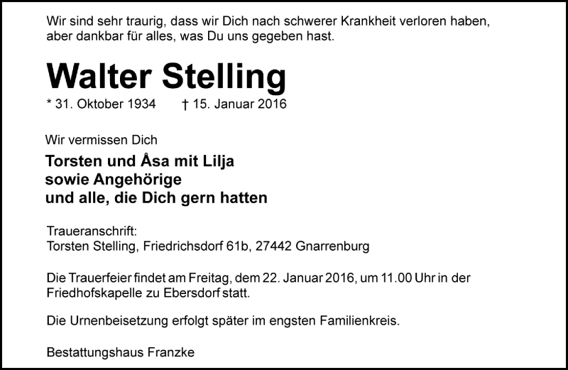 Hier finden Sie alle Traueranzeigen aus der Zeitung, die bisher für Walter Stelling erschienen sind. Weitere Traueranzeigen, die in der Zeitung erscheinen, werden hier ebenfalls aufgelistet